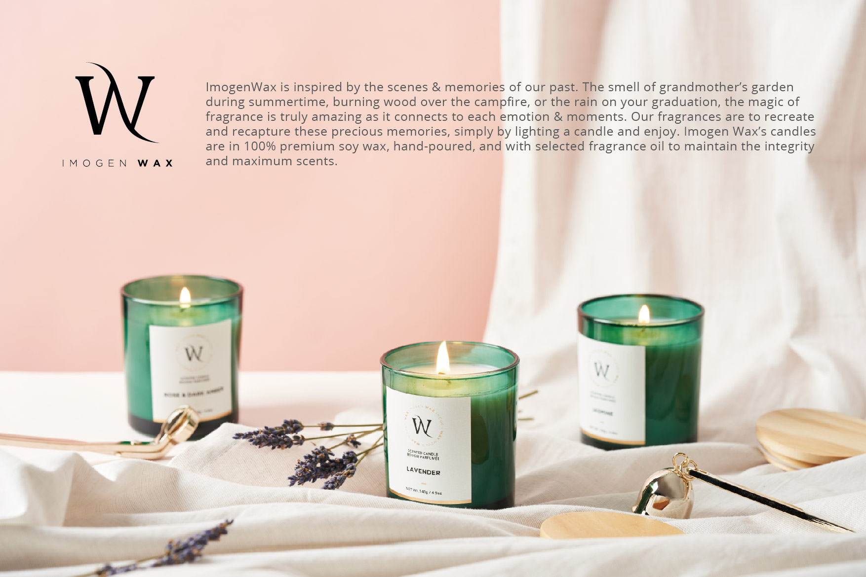 IMOGEN WAX的誕生來自於過往的記憶場景,也許是在那夏日時光,奶奶花園的花香;露營時,營火柴燒餘燼的味道;或是畢業典禮那天下著雨的味道。不可思議卻也真實地,味道連接著我們在當下的每個情緒與記憶。IMOGEN WAX期待藉由點燃每一顆蠟燭,重現那些珍貴的記憶。 IMOGEN WAX的蠟燭由100%優質的大豆蠟,以手工澆注的方式,及嚴選精油製造而成,保有最好的品質以及維持最好的精油香氛。